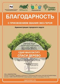 − Участники акции собирают отдельно от остального мусора бумажные отходы, которые образуются в процессе жизнедеятельности офиса – это бумага, журналы, рекламная полиграфия, газеты, книги, бумажная упаковка, картон, − пояснила главный специалист в сфере природоохранного и рекламного законодательства Ольга Чиркова, которой, кстати, также присвоено звание эко-героя. – Акция призывает практиковать в быту культуру отдельного сбора макулатуры. По статистике одна семья за год «выбрасывает» в мусорное ведро 1-2 взрослых дерева. Саянск сдал 771 килограмм макулатуры. Акция «Сдай макулатуру – спаси дерево» будет проходить в Иркутской области регулярно один раз каждые полгода.