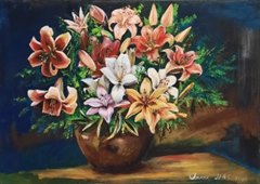 Особое внимание зрителей притягивает картина «Лилии», написанная летом 2020 года, работа над ней растянулась во времени. Дело в том, что лилии расцветают не все сразу, разные сорта и виды цветут в разное время, поэтому и писать с натуры пришлось по мере их распускания.