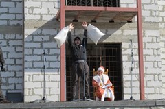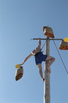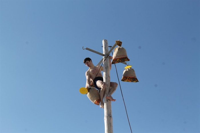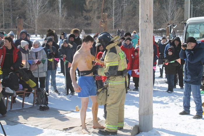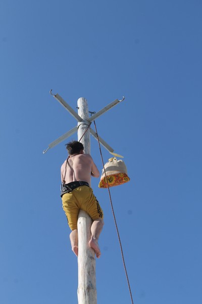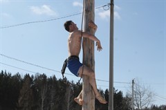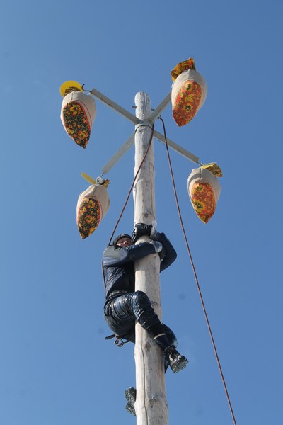 В этом году подарки на масленичный столб «загружали» четыре раза – для ловких и смелых было приготовлено 16 мешков с подарками. Молодые люди один за другим взбирались на столб. Делали это со страховкой и соблюдением всех требований безопасности, которые обеспечивали сотрудники МЧС. Самый первый забрался прямо в одежде, обмазав себя сгущенкой – как он объяснил, чтобы не скользить. У него получилось. Следующие раздевались, а, чтобы не скользить, использовали мед.