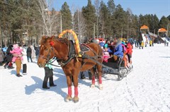 В Снежном городке развернулись торговые ряды, можно было покататься на лошадях, посмотреть, как смельчаки взбираются на масленичный столб за подарками и самим попытать удачу, принять участие в веселых аттракционах.