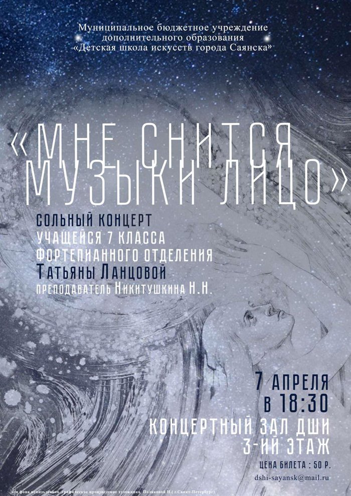 Сольный концерт учащейся 7 класса фортепианного отделения Татьяны Ланцовой (преподаватель Надежда Никитушкина) состоится 7 апреля в 18:30 в концертном зале ДШИ.