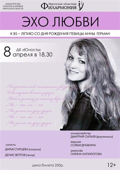 К 85-летию со дня рождения Анны Герман концерт солистов Иркутской областной филармонии Дарьи Старцевой и Дениса Ветрова. Концерт состоится 8 апреля в ДК "Юность".