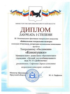 Театральное объединение «Конопушки» саянского детского сада №10 «Дюймовочка» стало победителем III Регионального фестиваля театрального искусства «Байкальская театральная палитра» в номинации «Спектакли, литературно-музыкальные композиции». Руководит объединением педагог детского сада №10 Лариса Сафонова.