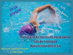Плавательный бассейн "Дельфин" 17-18 апреля встречает участников матчевой встречи по плаванию среди городов Иркутской области. Начало соревнований в 9:00.