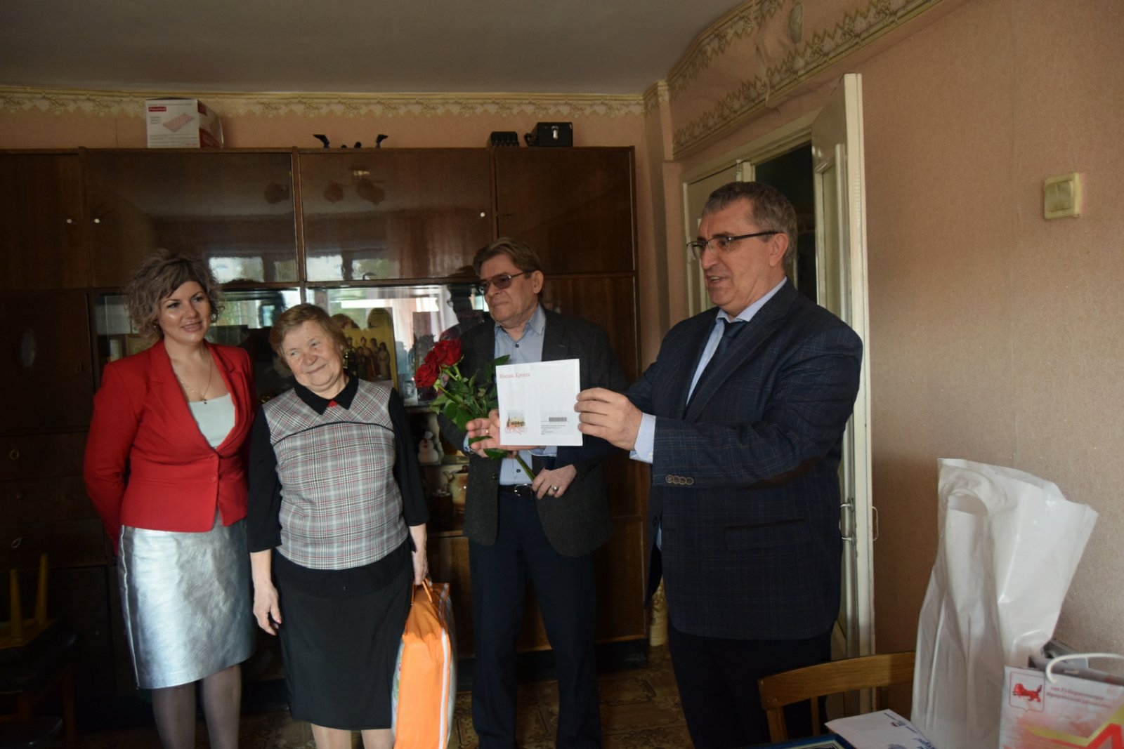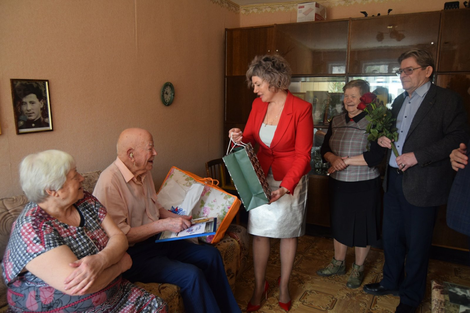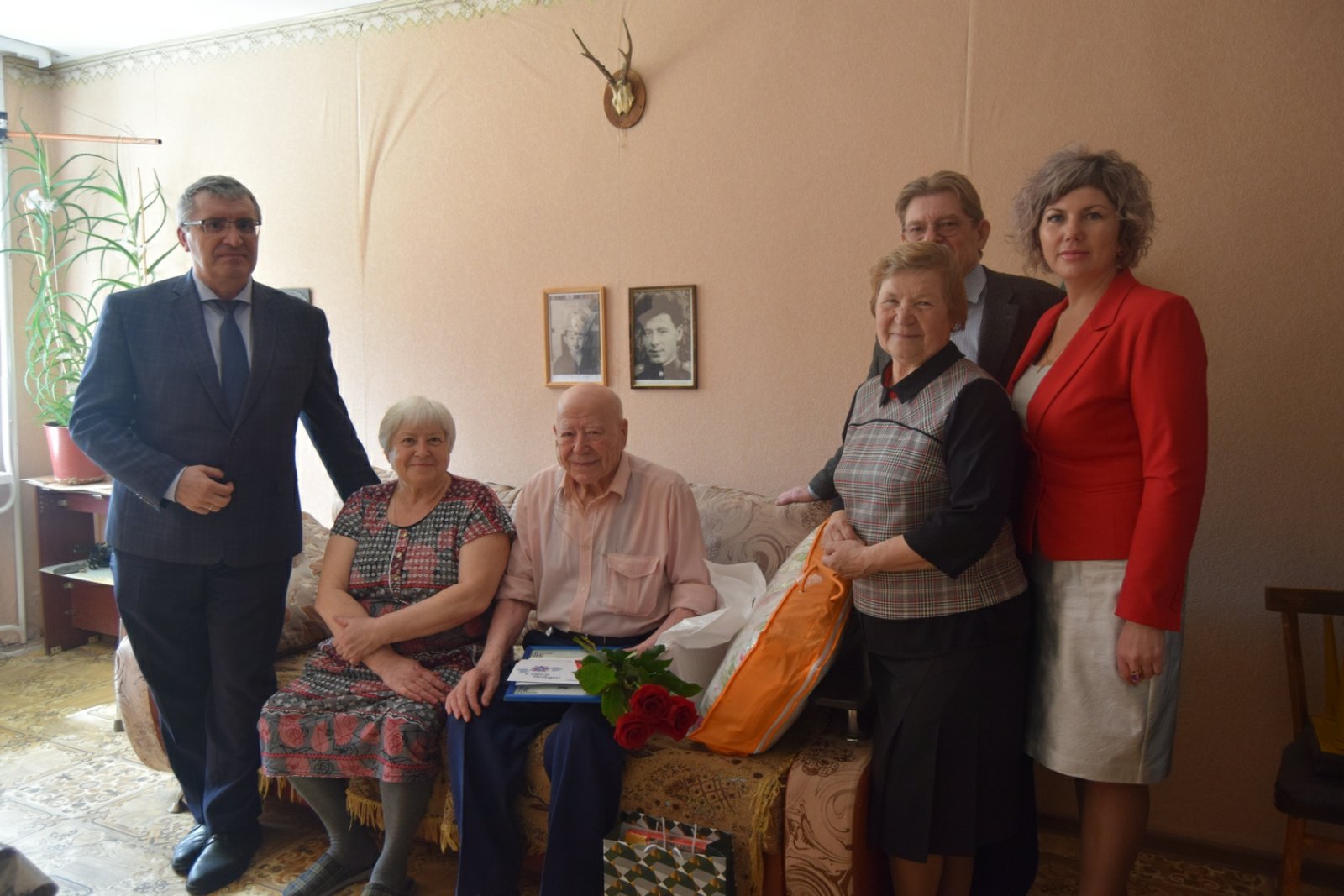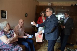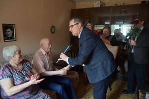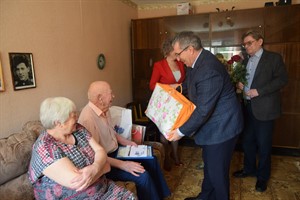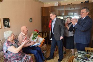 Поздравить юбиляра с замечательной датой и приближающимся праздником Днем Победы приехали заместитель мэра города Александр Ермаков, председатель совета ветеранов Галина Алексеева, начальник саянского отдела загс Марина Дощечкина, руководитель управления социальной защиты населения Сергей Кривопалов.