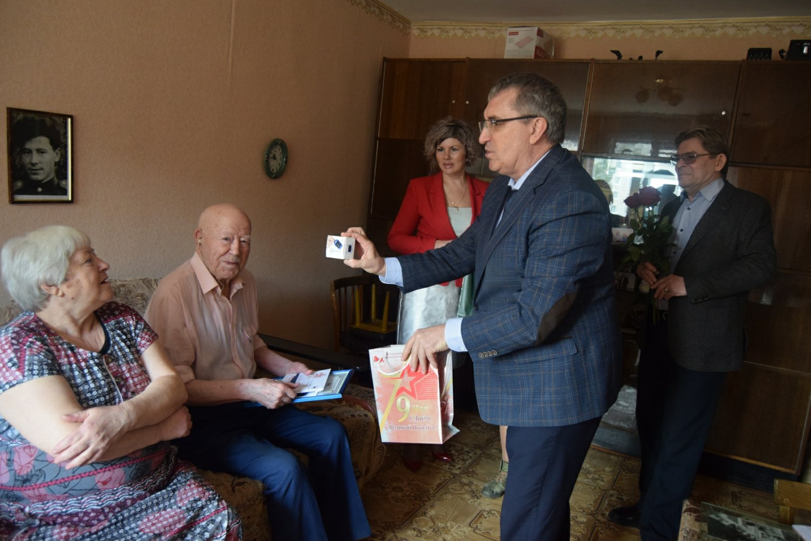 Александр Владимирович со словами признательности за подвиг от имени мэра города Олега Боровского вручил юбиляру поздравительную открытку и подарок – теплое, легкое одеяло. Подарки для участников Великой Отечественной войны, проживающих в нашем городе, приобретены из средств Саянского благотворительного фонда местного сообщества.