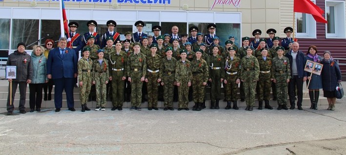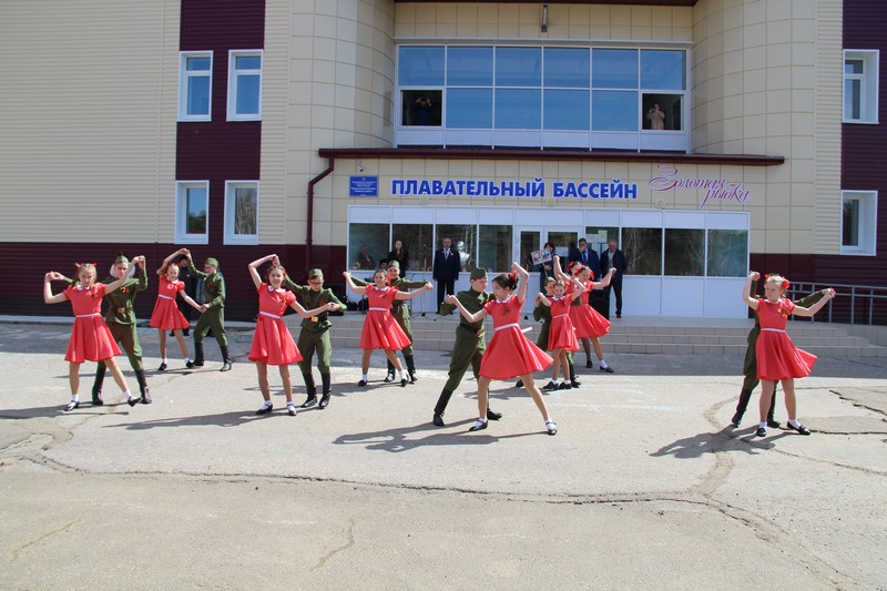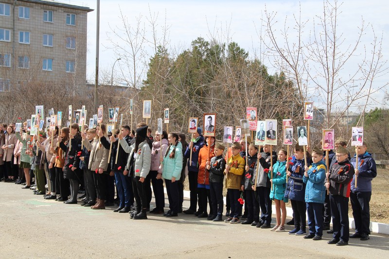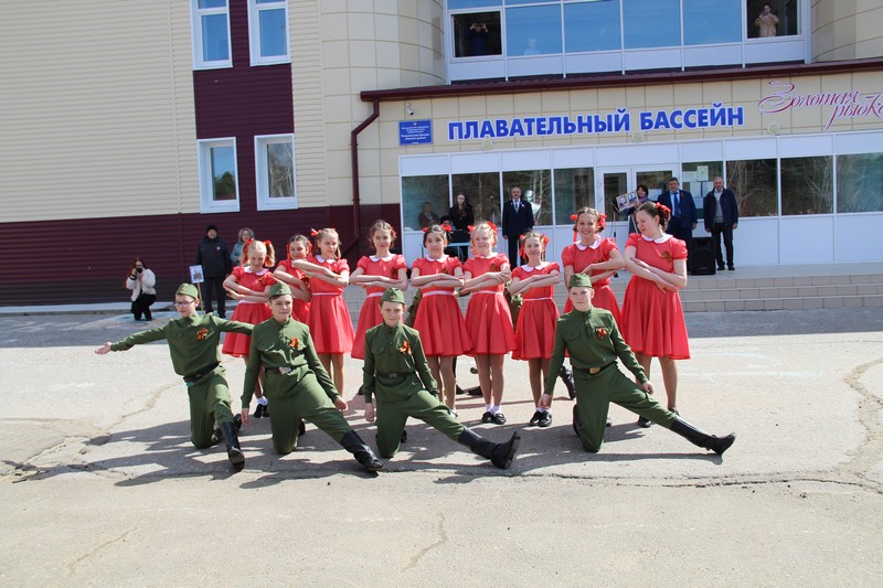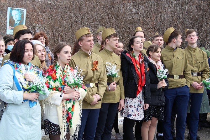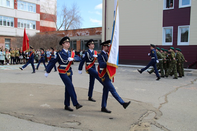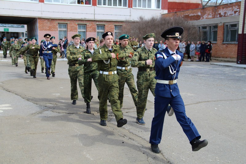Шестиклассники исполнили танец «Смуглянка», после чего торжественным маршем, чеканя шаг, прошли юнармейцы, держа равнение на памятник Герою Советского Союза Дмитрию Перову. Государственный флаг Российской Федерации и знамя Победы внесла знаменная группа, после чего была объявлена минута молчания в память о тех, кто не вернулся с войны.
