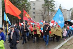 Праздничная колонна, украшенная флагами, транспарантами, воздушными шарами и цветами прошествовала по центральным улицам Саянска к городской торговой площади, где проходит торжественный митинг «Победа, которую нам завещали!».