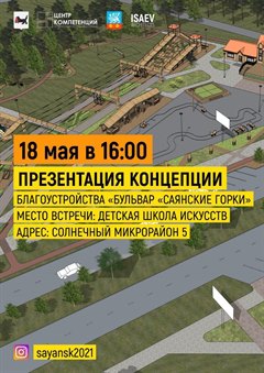 Уважаемые горожане! Для участия Саянска во Всероссийском конкурсе лучших проектов создания комфортной городской среды в 2021 году, архитектурным бюро ISAEV ARCHITECTS разработана концепция благоустройства зоны отдыха «Бульвар «Саянские горки». Презентация концепции состоится 18 мая в 16:00 в Детской школе искусств (микрорайон Солнечный, дом №5). Приглашаем всех желающих принять участие в мероприятии.