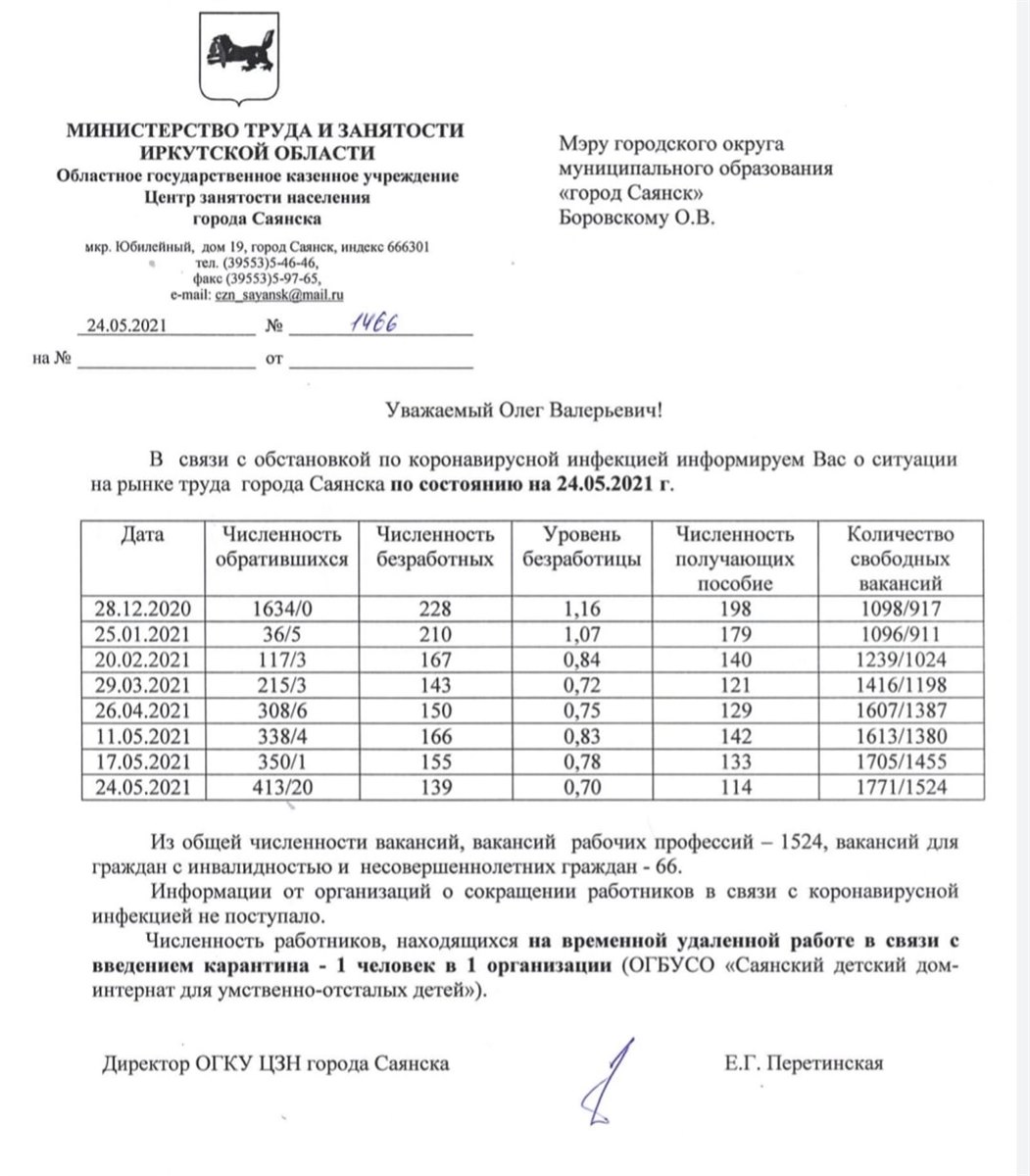 Информация на рынке труда города Саянска по состоянию на 24.05.2021г.