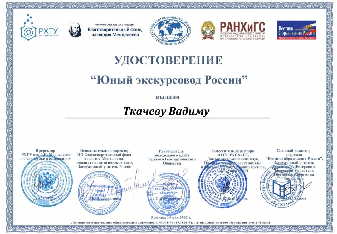 Вадим Ткачев под руководством учителя истории и обществознания Натальи Шоповой подготовил материал и, используя квадракоптер, снял и озвучил видео-экскурсию «Виртуальный гид. Саянск». В номинации конкурса «Туризм и путешествия» он занял 3 призовое место среди большого числа участников со всей России. Кроме диплома ему вручено именное удостоверение «Юный экскурсовод России».