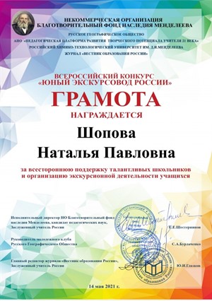 Благодарность за всестороннюю поддержку талантливых детей и организацию экскурсионной деятельности учащихся объявлена педагогу Наталье Шоповой.