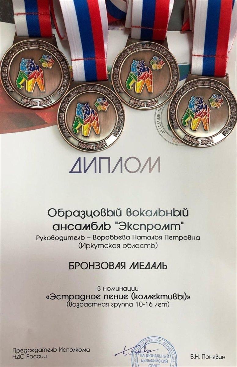 Итоги юбилейных дельфийских игр были подведены 25 мая на церемонии закрытия в Перми. Саянский коллектив «Экспромт» Детской школы искусств, руководитель Наталья Воробьева, стал обладателем бронзовой медали в номинации «Эстрадное пение (коллективы)», возрастная группа 10-16 лет.