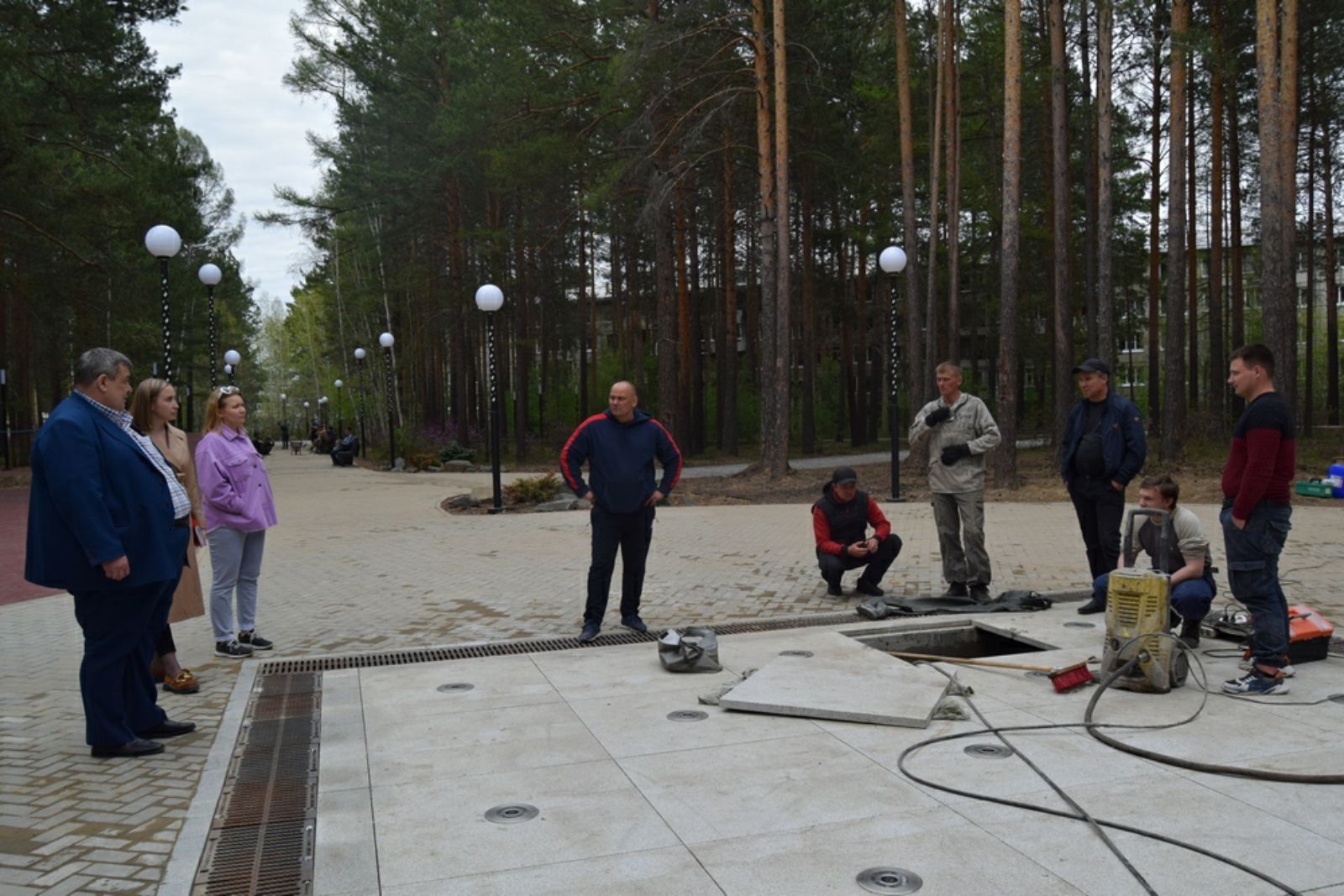 В настоящее время подрядчик, компания «СтройПроектСервис», производившая строительство объектов в парке, устраняет «недоделки» - то, что не успела выполнить осенью, и что требует доработки после зимы. В частности, ремонтирует дорожки, на некоторых участках была полностью переложена брусчатка. Завершаются работы по возведению амфитеатра. Олег Валерьевич дал задание строителям привести в порядок прилегающие к дорожкам территории – отсыпать, выровнять, убрать строительные фрагменты. Сотрудники субподрядной организации «Мегабасс», занимающиеся установкой технологического оборудования фонтана, доложили мэру, что фонтан, практически готов к запуску. Сейчас они промывают, чистят оборудование и после тестирования уже завтра готовы включить цветные струи воды.