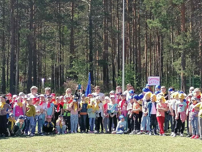 Праздник по случаю открытия летних оздоровительных лагерей завершился веселым флэшмобом. Ребята и педагоги выстроились в пестрое слово «Лето 2021».