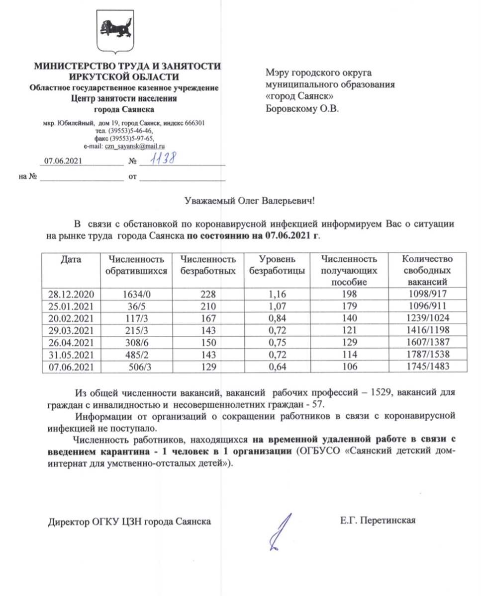 Информация на рынке труда города Саянска по состоянию на 07.06.2021г.