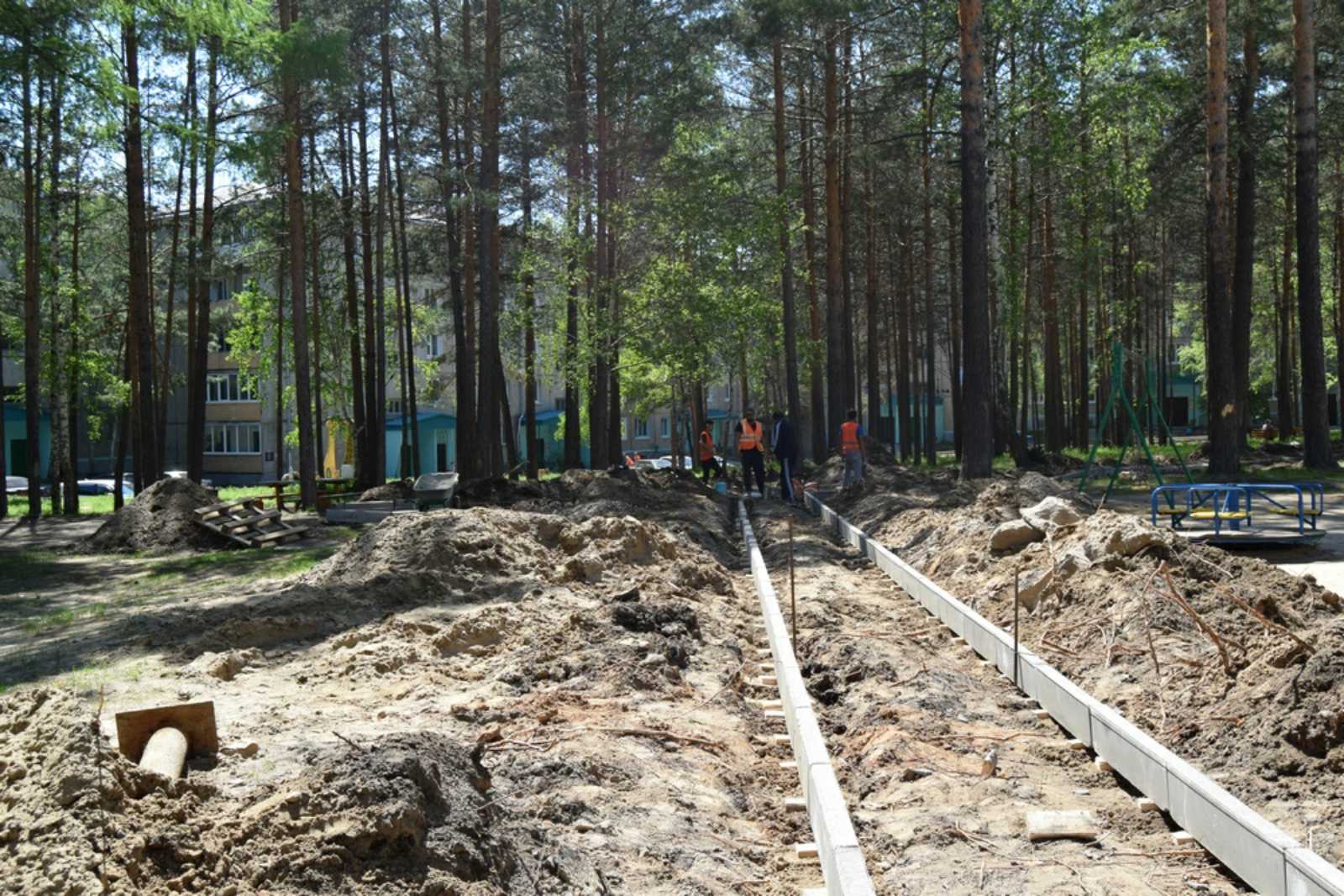 Ход работ во дворе дома № 8 микрорайона Центрального оценил Олег Валерьевич. Здесь почти завершена установка бордюрного камня, расширены проезды, сделаны тротуары - раньше их не было. В ближайшее время, смотря по погодным условиям, строители начнут укладку асфальта. Также по просьбе жителей ведется обустройство пешеходных дорожек в лесной зоне двора. Параллельно начаты работы во дворе дома № 5 микрорайона Строителей. Здесь демонтирован бордюрный камень, устанавливается новый.