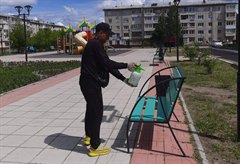 Сотрудники управления обслуживания социальной сферы провели санитарную обработку городских скверов и парков. Дезинфицирующим средством тщательно обрабатывались скамейки, малые формы на детских и спортивных площадках.
