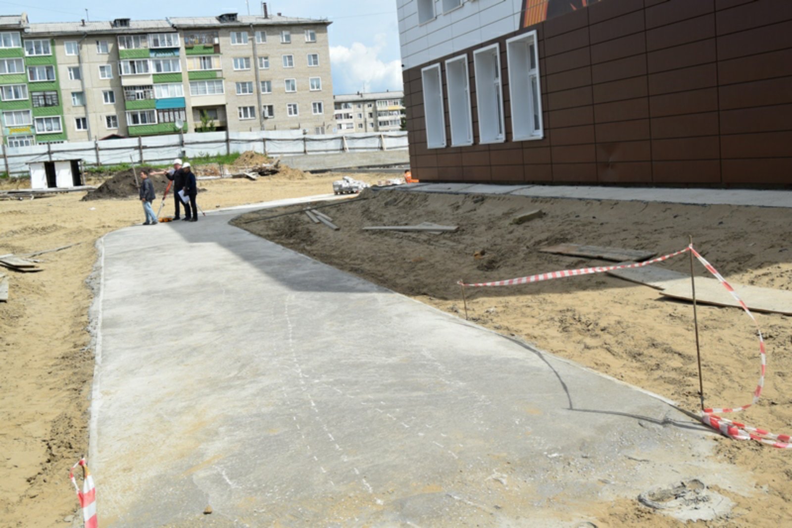 Подготовлены площадки (залит бетон) под пожарные лестницы, залиты бетонные отмостки. На территории завершается установка бордюрного камня. Спланированы спортивные площадки, клумбы. При благоприятных погодных условиях на текущей неделе начнется укладка асфальта на площадках и тротуарах. Продолжается монтаж светильников в помещении и уличного освещения.
