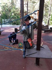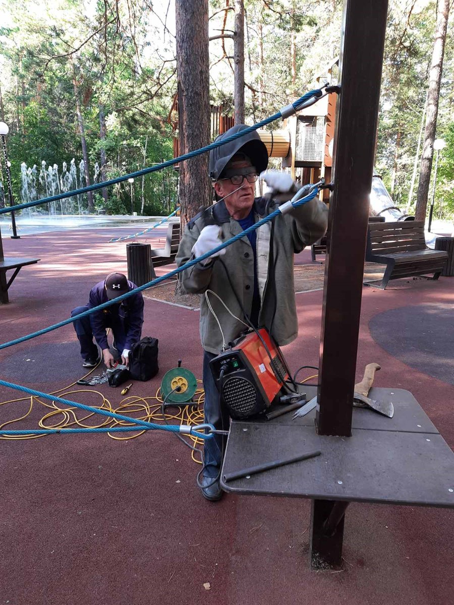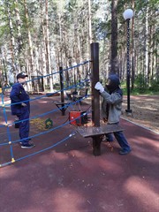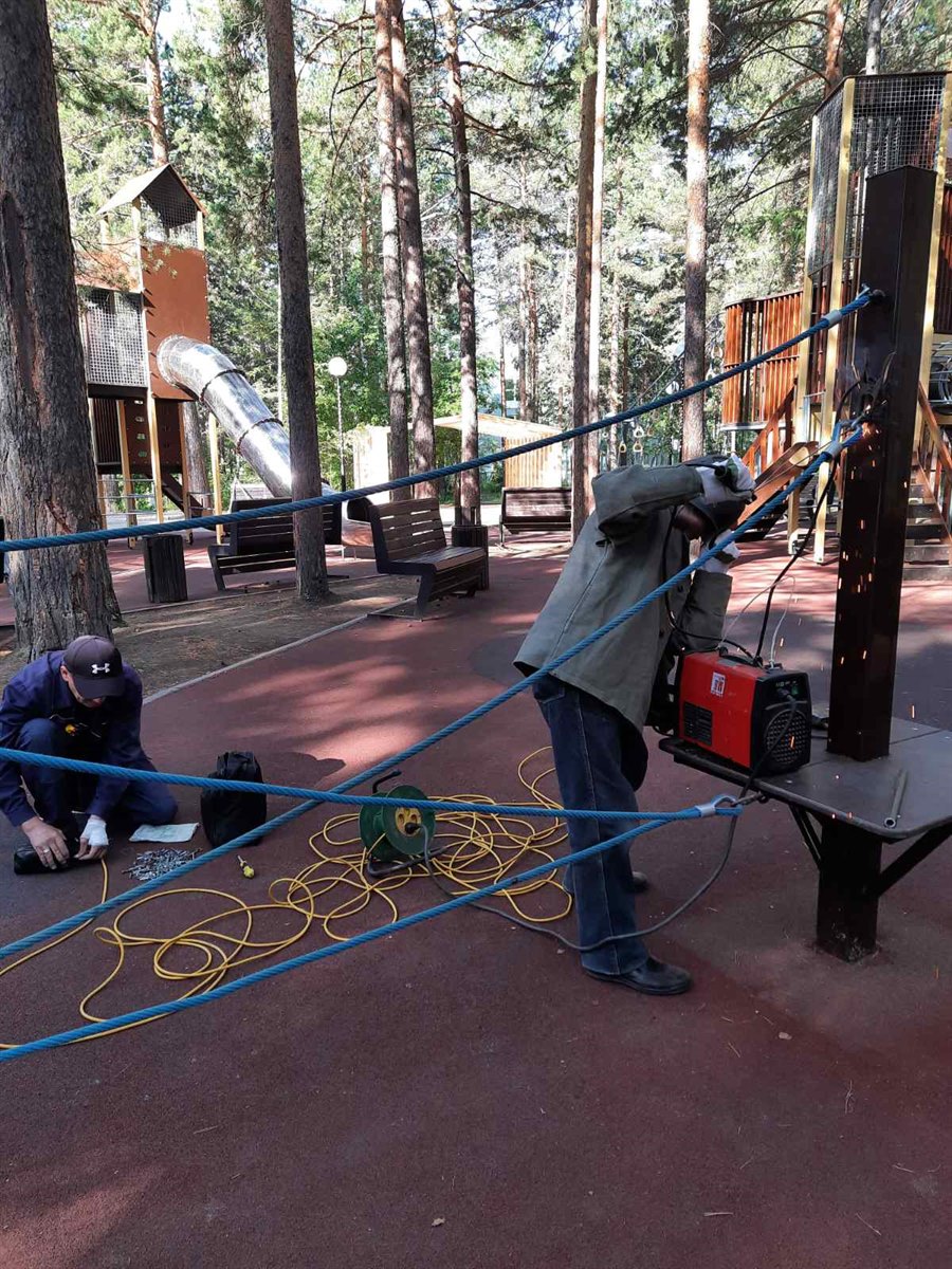 Складывается впечатление, что местные хулиганы следуют девизу «ломать - не строить». На этот раз в парке были вырваны крепления в веревочном городке на детской площадке. Теперь они закреплены сваркой. Также был выполнен мелкий ремонт веревочных лестниц.