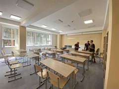 Высокие открытые потолки в бассейне, хореографическом, актовом и спортивном залах выглядят необычно и складывается впечатление, что они не доделаны, но это современные требования пожарной безопасности, так что и здесь школа отвечает стандартам.