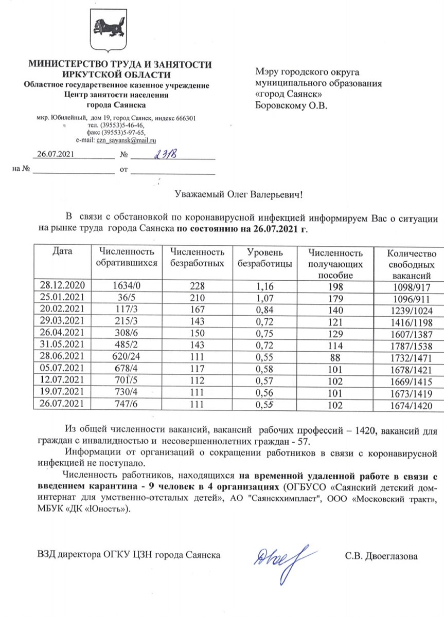 Информация на рынке труда города Саянска по состоянию на 26.07.2021г.