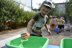 Следующим этапом на пути в подводное царство стала игра, которая заключалась в том, чтобы, как можно быстрее наполнить бассейн водой. И тут не было, проигравших, бассейн ребята, словно договорившись, наполнили одовременно.