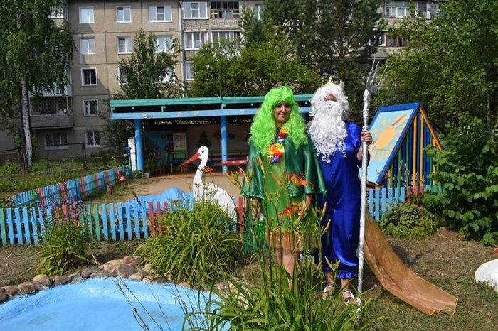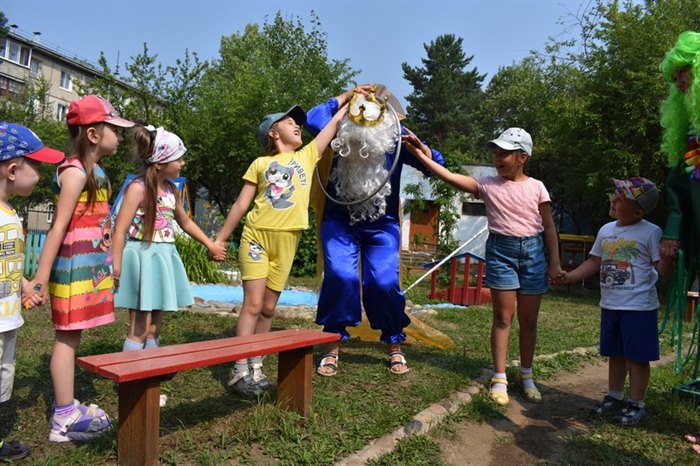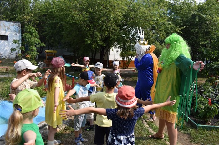 Нынешняя неделя в детском саду №25 «Василек» посвящена воде. Ребята занимаются исследовательской деятельностью, проводят различные эксперименты с водой, рисуют реки, ручьи, моря и океаны, а сегодня педагоги устроили ребятам морской праздник и пригласили гостей − морского царя Нептуна со своей дочерью − морской царицей.