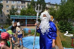 К развеселившимся ребятам под звуки моря вышел Нептун − величавый, сильный, мудрый повелитель морей, потоков, рыб и медуз. Хозяин морей и океанов предложил ребятам погрузиться на морское дно и поиграть в морские игры. Под теплые брызги воды ребятишки играли в «Море волнуется». Дочь Нептуна придумала конкурс под названием «Волна», суть игры заключалась в том, чтобы, держась за руки и не расцепляя их, передать обруч соседу, тем самым образуя волну.