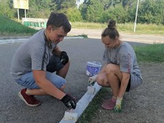 Мария и Данил тоже охотно трудятся в управляющей компании в период летних каникул. Белят бордюры, убирают скошенную траву, подметают мусор во дворах.