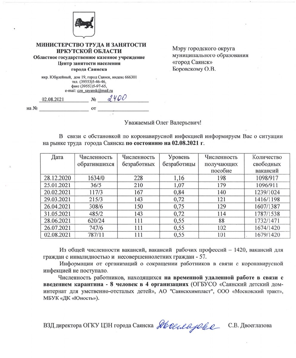 Информация на рынке труда города Саянска по состоянию на 02.08.2021г.