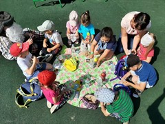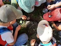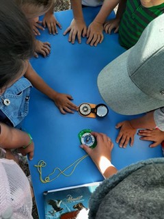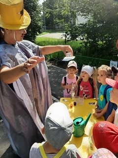 Для того, чтобы простую прогулку превратить в поход, в различных уголках территории детского сада поселились лесные обитатели: Всезнамус, Старичок-Лесовичок и мудрая Сова. О роли леса в жизни человека, и о том, что солнце является источником жизни на земле и как по солнцу можно определить время, рассказал Старичок-Лесовичок. Опыты с водой в научно-исследовательской лаборатории совместно с детьми провел Всезнамус. А мудрая Сова, показала детям как при помощи лупы изучать насекомых, которые живут на пнях и в траве, а потом провела чудодейственный массаж сосновыми шишками.
