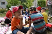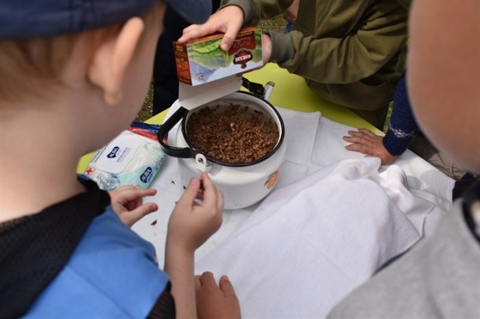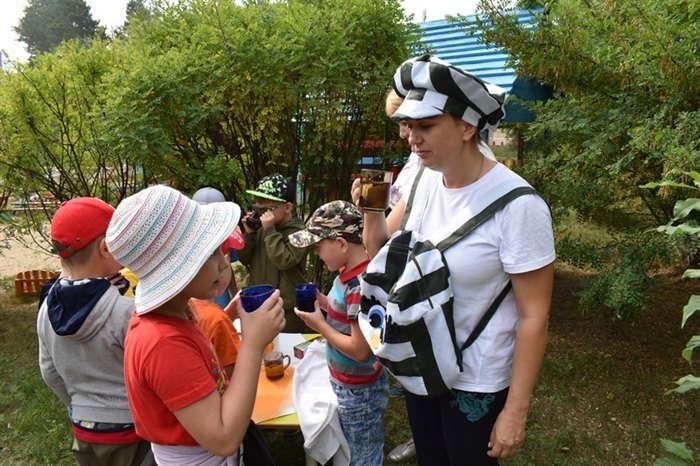 Пришло время доставать рюкзаки и раскладывать «скатерть-самобранку». «Веселый рюкзачок» рассказал про необходимые предметы, которые обязательно должны быть в рюкзаке туриста. Маленькие «туристы» взяли в поход бутерброды, воду и сладкие напитки. Но для того чтобы пообедать на природе, необходимо заварить лесной чай. «Веселый рюкзачок» рассказал о том, какие в лесу растут полезные травы и ягоды. Чаепитие натуралистам понравилось, витаминизированный напиток из лесных ягод взбодрил и придал сил.