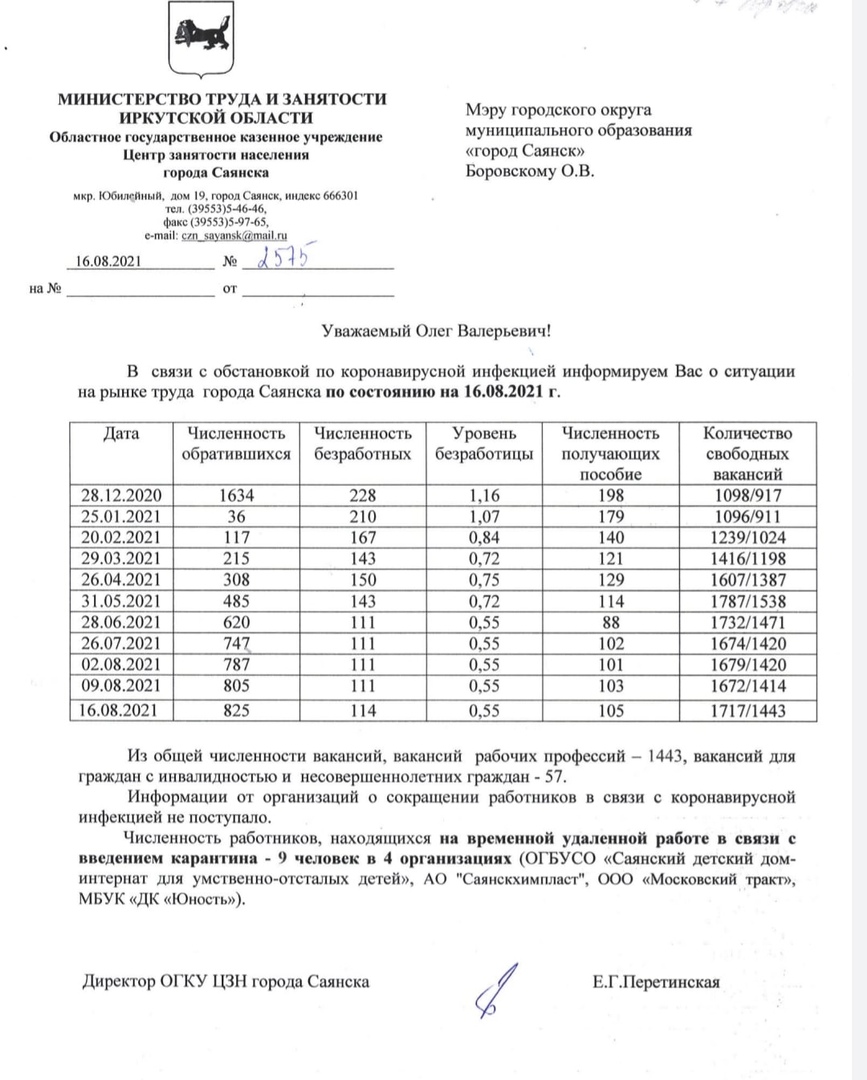 Информация на рынке труда города Саянска по состоянию на 16.08.2021г.