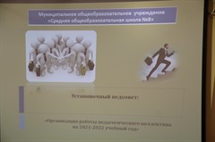 Установочный педсовет сформировал органы управления, определил направления развития школы на 2021-2022 учебный год. Педагоги рассмотрели и утвердили основные и адаптированные образовательные программы, учебный план образовательного учреждения, календарный учебный график, локальные акты, регламентирующие образовательную деятельность. Был также рассмотрен порядок проведения Дня знаний и режим работы учащихся в условиях распространения коронавирусной инфекции.