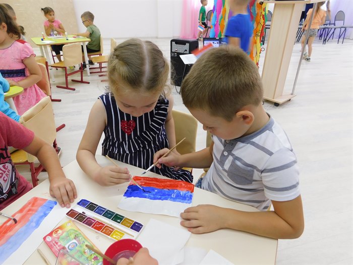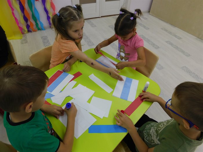 В игре «Я живу в России» дети нашли ответы на загадки о гимне, гербе, флаге, президенте страны. Понравилась детям игра на внимание «Найди Российский флаг». Кульминацией мероприятия стала продуктивная деятельность − рисование красками и фломастерами, аппликация. Каждый ребенок унес с собой сделанный собственными руками бело-сине-красный флаг.