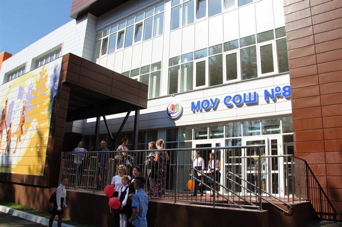 Прозвенел первый звонок и больше 500 ребят переступили порог школы № 8. Родители, школьники и педагоги в восторге от нового места учебы, ведь буквально два года назад здесь был пустырь, а теперь располагается современное здание площадью 15 тыс. кв. м.