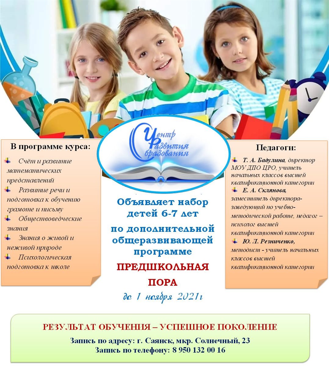 Центр развития образования объявляет набор детей по дополнительной общеобразовательной программе "Предшкольная пора" до 1 ноября 2021 года