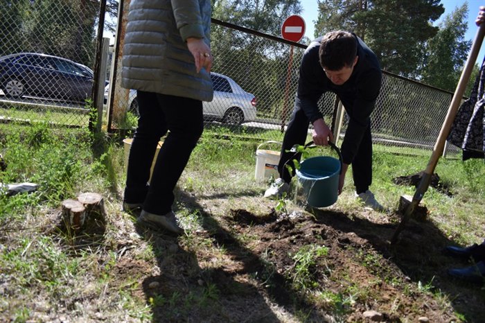 Активная трудовая деятельность началась после уроков. Старшеклассники и родители подготовили лунки для кустарников. Младшие классы распределяли растения, а все вместе присыпали саженцы землей, поливали, подвязывали к колышкам.