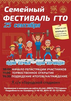 Семейный фестиваль ГТО состоится 25 сентября на городском стадионе. Начало регистрации участников в 10.00, торжественное открытие – в 11.00.