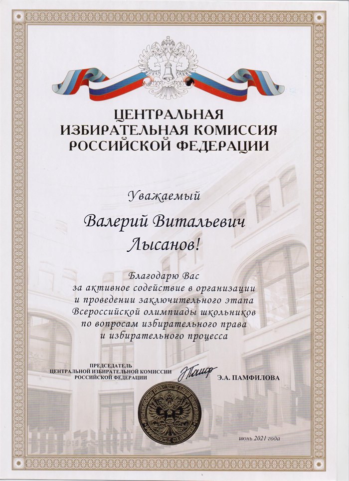Учителю истории и обществознания школы № 7 Валерию Лысанову объявлена благодарность председателя Центральной избирательной комиссии России Эллы Панфиловой «за активное содействие в организации и проведении заключительного этапа Всероссийской олимпиады школьников по вопросам избирательного права и избирательного процесса». Награждение прошло 7 сентября в саянской Территориальной избирательной комиссии.