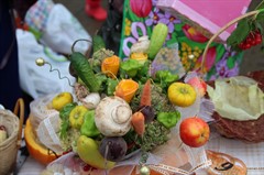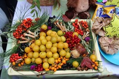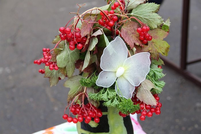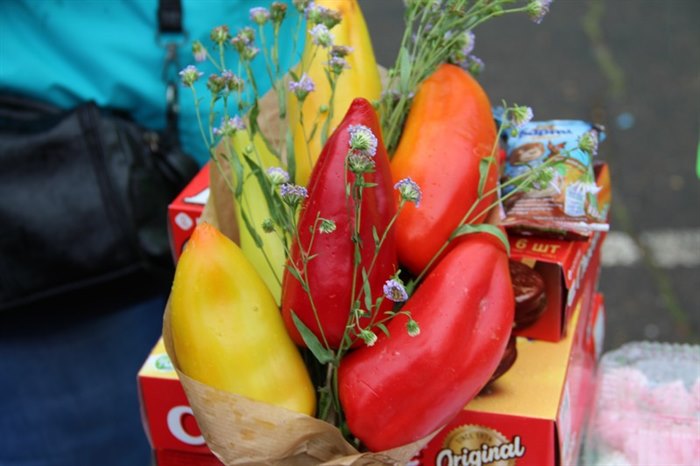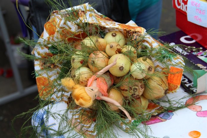 Поражало покупателей воображение умельцев, составивших букеты не только из шафранов и гладиолусов, но и золотистых луковиц, сладких разноцветных перцев, калины и рябины, красной смородины и черемухи, грибов и шишек. Торговые прилавки были украшены корзинками их кабачков, плетеными из бисера лукошками, вазами из патиссонов.