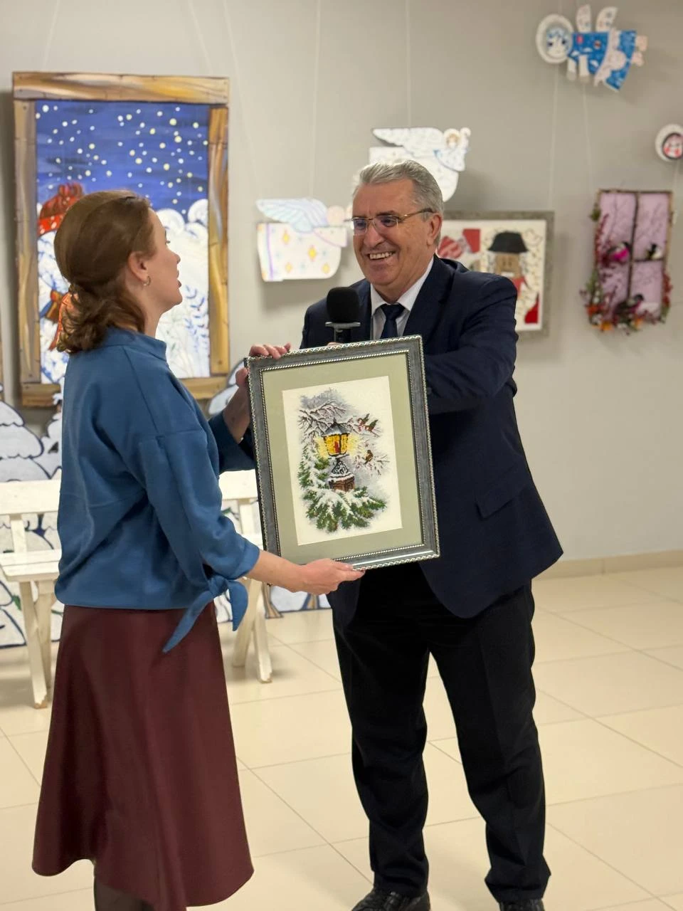 Особенным сюрпризом для всех стал личный вклад мэра города. Александр Ермаков поддержал выставку, подарив ей работу, выполненную собственными руками, — картину под названием «Рождественский фонарь». Этот жест добавил мероприятию особую, душевную ноту, подчеркнув, что созидательное творчество объединяет всех жителей Саянска, независимо от возраста и положения.