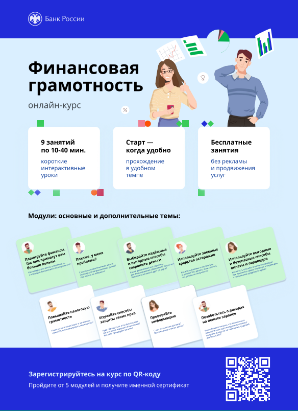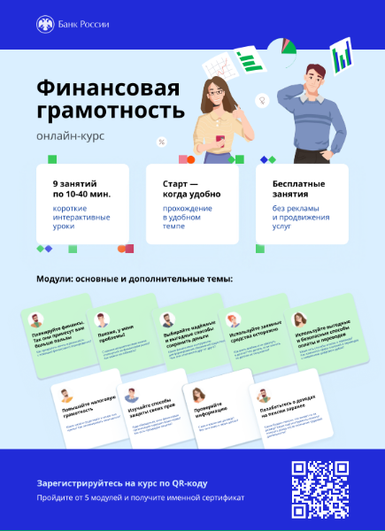Департамент финансов запускает обучение по дистанционному курсу «Финансовая грамотность», разработанному профильными экспертами Банка России. Курс включает в себя 9 учебных модулей по основным финансовым тематикам и ориентирован на взрослое население независимо от уровня подготовки. Прохождение обучения доступно на сайте Университета Банка России по ссылке: https://finclass.info/_wt/fingram_start. Структура обучения включает в себя: заполнение входного опроса для участников обучения; прохождение учебных модулей и интерактивных заданий для проверки освоения материала; заполнение итогового опроса для сбора обратной связи. Основной целью курса является освоение обучающимися знаний по основным финансовым тематикам и формирование навыков грамотного финансового поведения. Модули курса имеют практическую направленность, что способствует соотнесению полученных знаний с жизненными ситуациями. Приглашаем всех заинтересованных пройти курс.