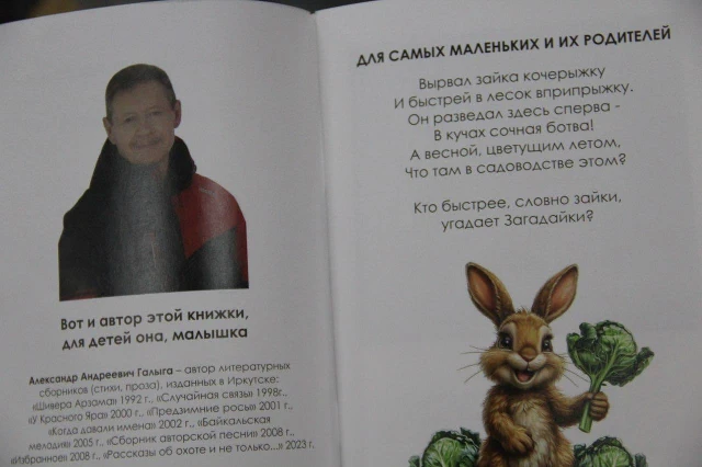 В дошкольном учреждении «Солнышко» состоялась творческая встреча. Писатель, поэт и бард Александр Галыга представил юным саянцам и их родителям свою новую книгу «Загадайки». Это прекрасно иллюстрированное издание — первая из десяти книг автора, обращённых к детской аудитории.
