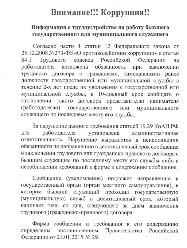 Информация о трудоустройстве на работу бывшего государственного или муниципального служащего