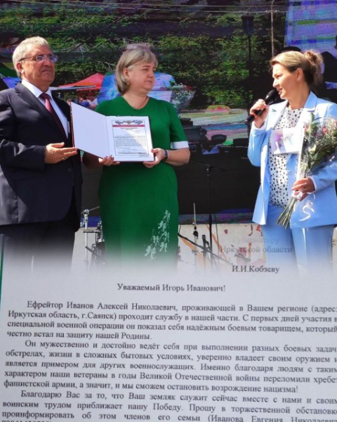 В адрес губернатора Иркутской области Игоря Кобзева поступило благодарственное письмо от командира войсковой части 30-ой отдельной мотострелковой бригады полковника А. Полякова, где он отмечает ратный труд ефрейтора Алексея Николаевича, который мужественно и достойно выполняет боевые задачи, является примером для других военнослужащих
