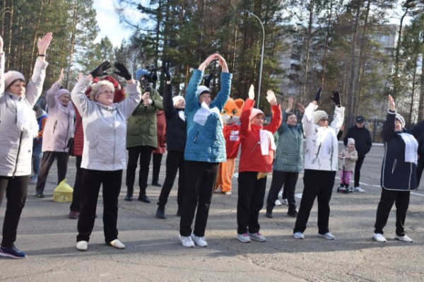 На зарядку становись! Довольно прохладная погода не помешала активным саянцам всех возрастов принять участие в спортивно-развлекательном мероприятии «Жить здорово!»