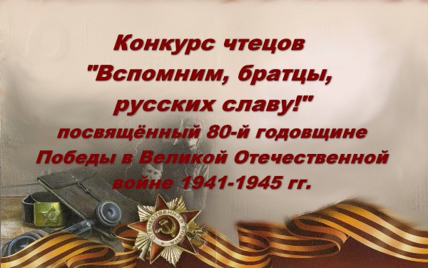 Центральная городская библиотека и Совет ветеранов приглашают к участию в муниципальном конкурсе чтецов "Вспомним, братцы, русских славу!", посвящённом 80-й годовщине Победы в Великой Отечественной войне 1941- 1945гг., который проводится в рамках областного фестиваля смотра любительских объединений, клубов по интересам и творческих коллективов ветеранов "Не стареют душой ветераны".