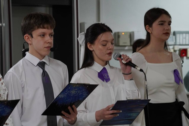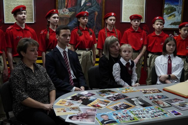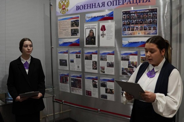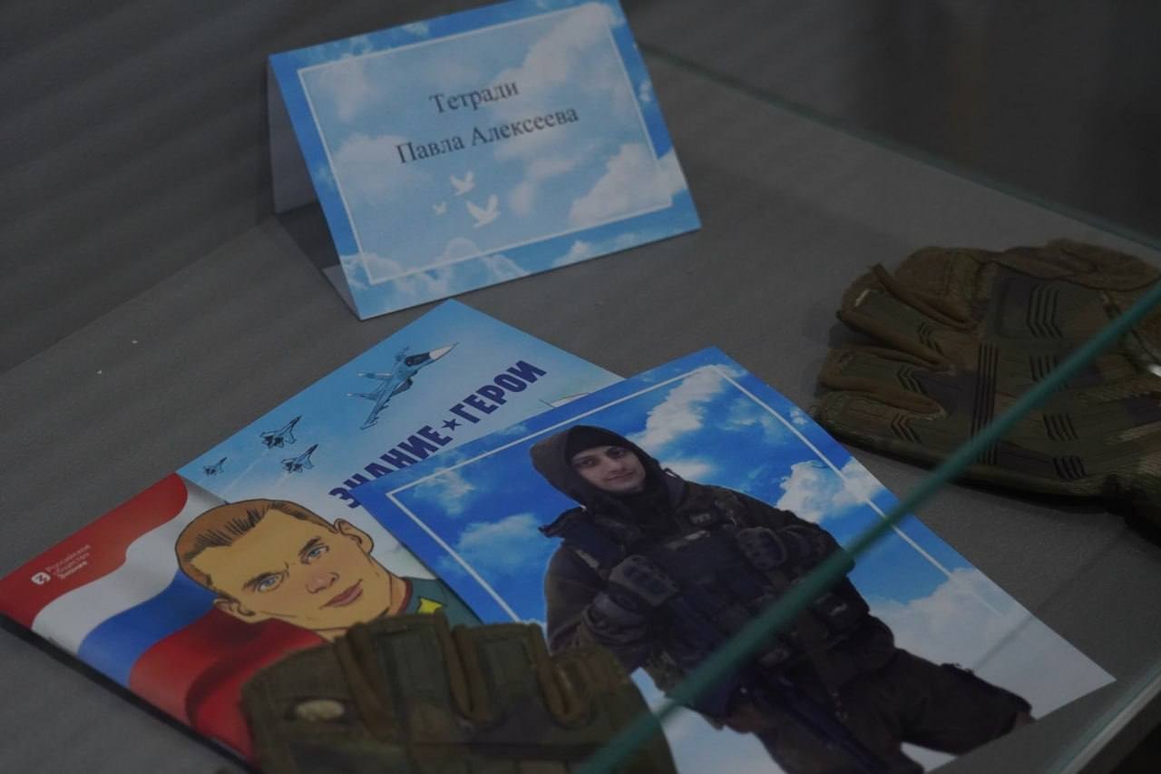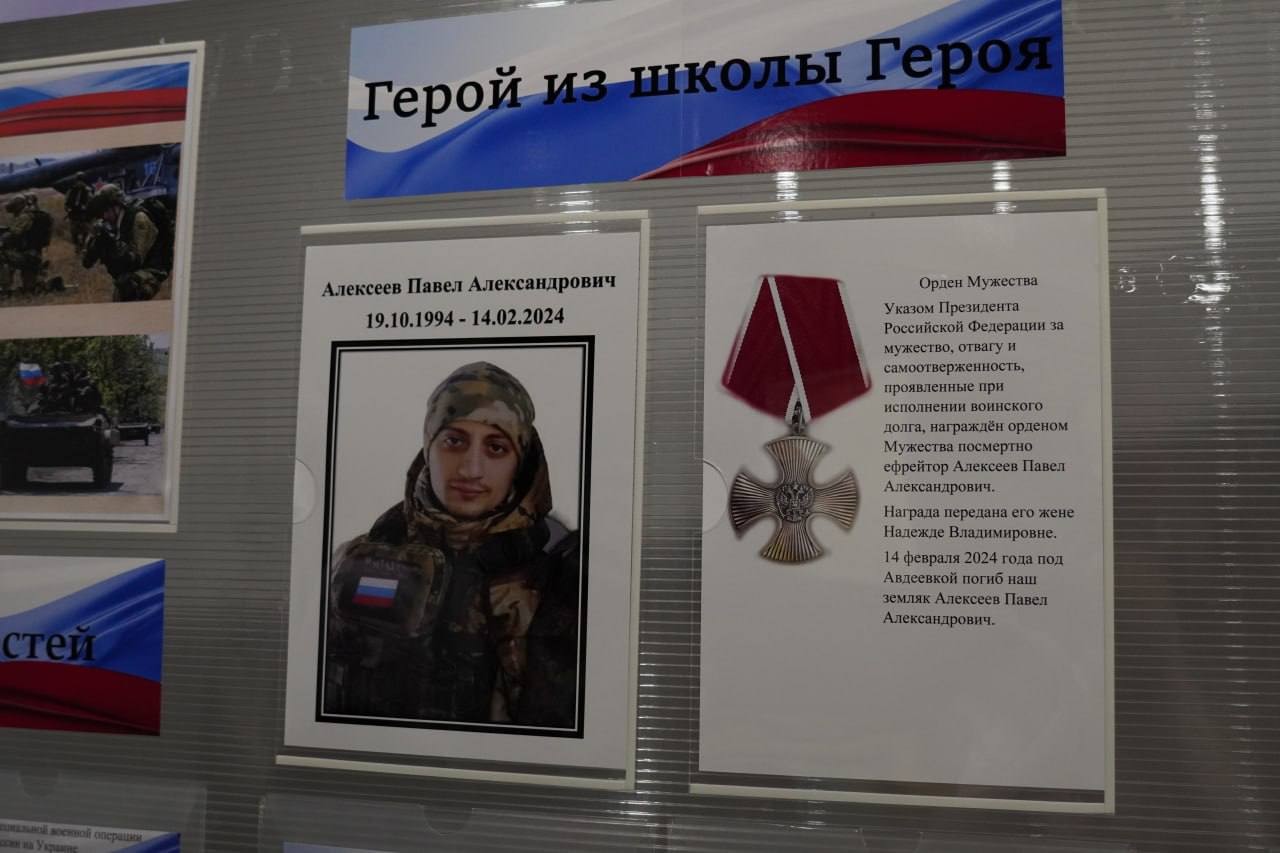 В рамках проекта «Герой из школы Героя» старшеклассники подготовили фильм и экспозицию в школьном музее боевой славы памяти Павла Алексеева. После торжественной линейки они представили свою работу гостям и семье бойца.
